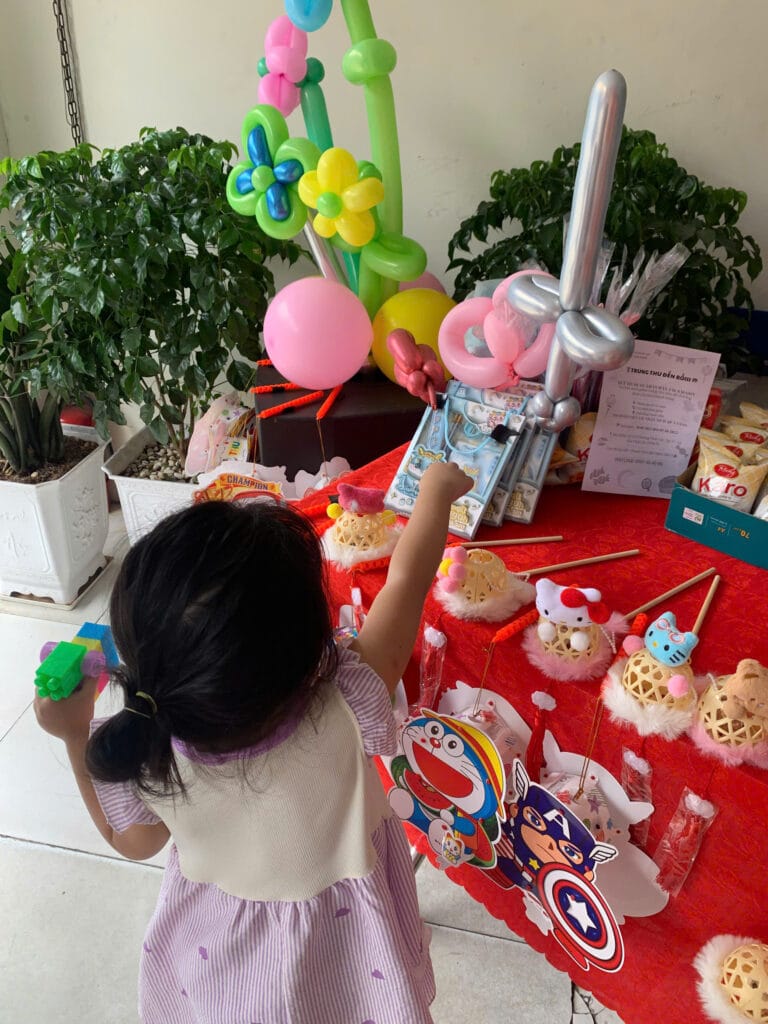 Trò Chơi “Ném Tiêu Trúng Quà”: Đây là điểm nhấn của chương trình, một trò chơi đơn giản nhưng tạo ra sự hứng thú và tiếng reo hò vui vẻ. Các bé đã thể hiện sự khéo léo để nhắm trúng các ô quà tặng hấp dẫn.